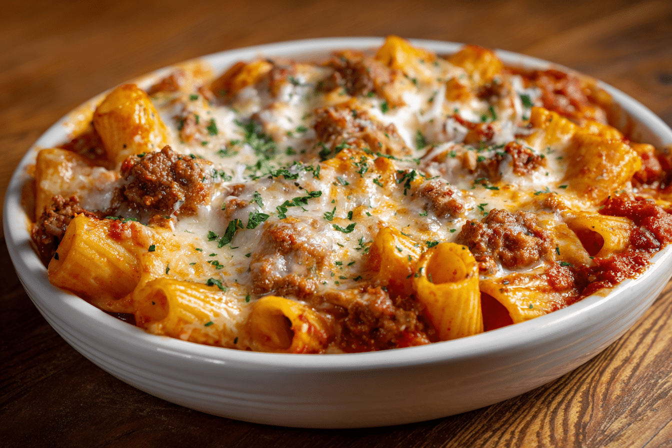 A hearty baked pasta dish loaded with rigatoni, seasoned ground beef, rich tomato sauce, and layers of melty mozzarella, ricotta, and Parmesan cheese. Classic comfort in every bite.
