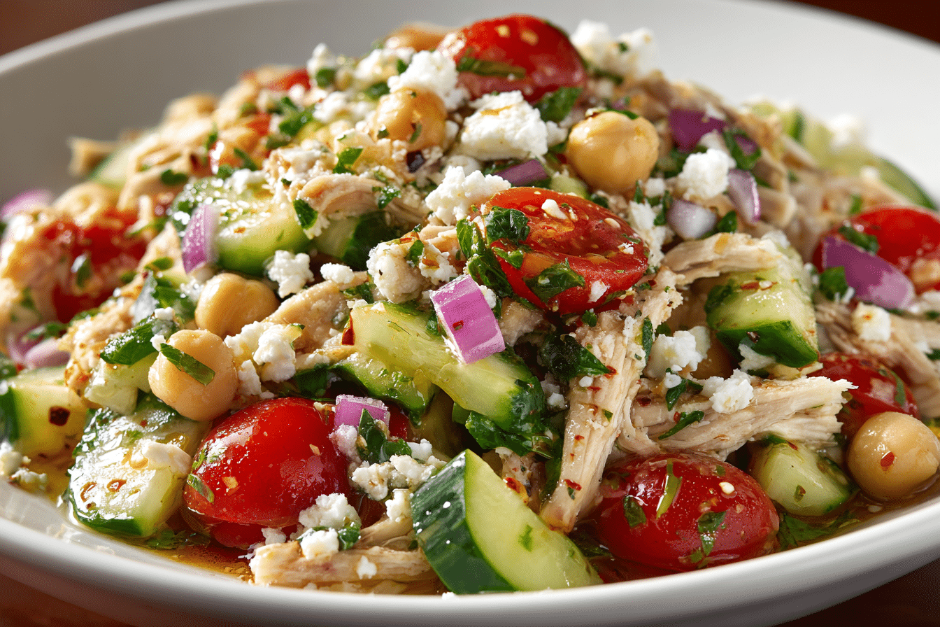 Chicken & Chickpea Salad is one of those all-in-one meals that’s as nourishing as it is refreshing. Packed with lean protein, fiber-rich chickpeas, crisp vegetables, and a zesty dressing, this Mediterranean-inspired salad is perfect for lunch prep, light dinners, or a satisfying post-workout meal.