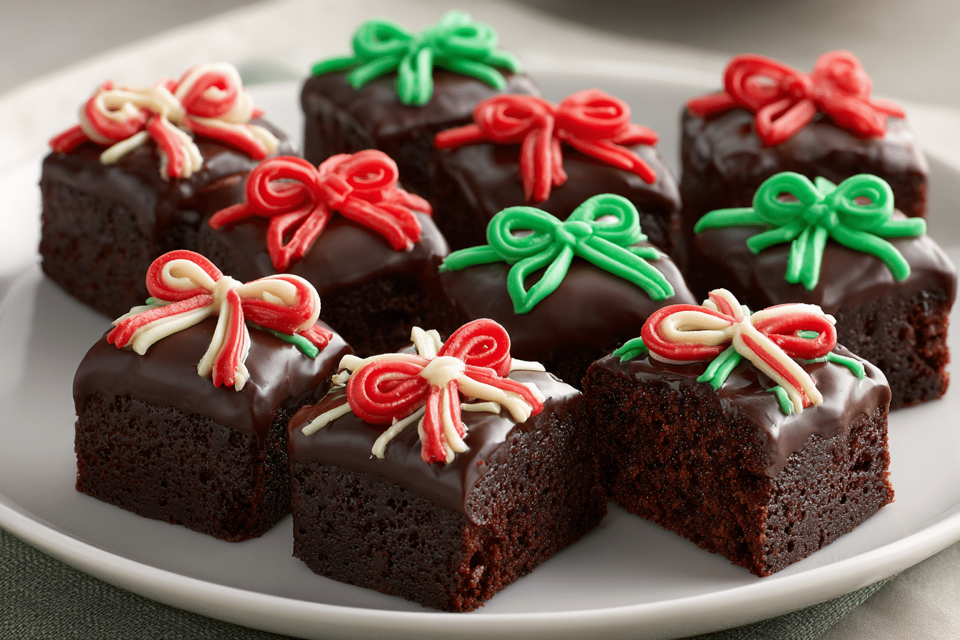 Fudgy chocolate brownies cut into neat squares and decorated like holiday gift boxes — a festive, delicious treat perfect for Christmas parties or gifting.