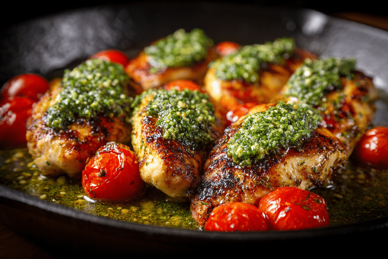 This one-skillet meal features golden-seared chicken simmered in a pesto-Parmesan cream sauce, finished with cherry tomatoes or spinach for a pop of color and freshness. It’s a weeknight-worthy recipe that also feels elegant enough for guests—savory, creamy, and bursting with herbaceous flavor.