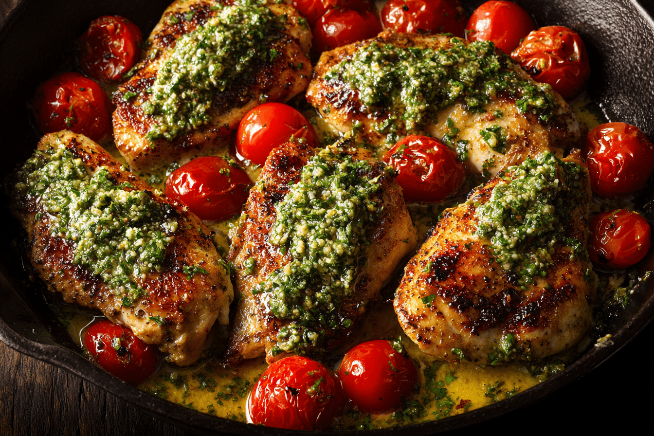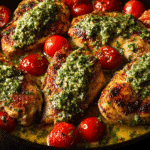 This one-skillet meal features golden-seared chicken simmered in a pesto-Parmesan cream sauce, finished with cherry tomatoes or spinach for a pop of color and freshness. It’s a weeknight-worthy recipe that also feels elegant enough for guests—savory, creamy, and bursting with herbaceous flavor.