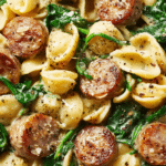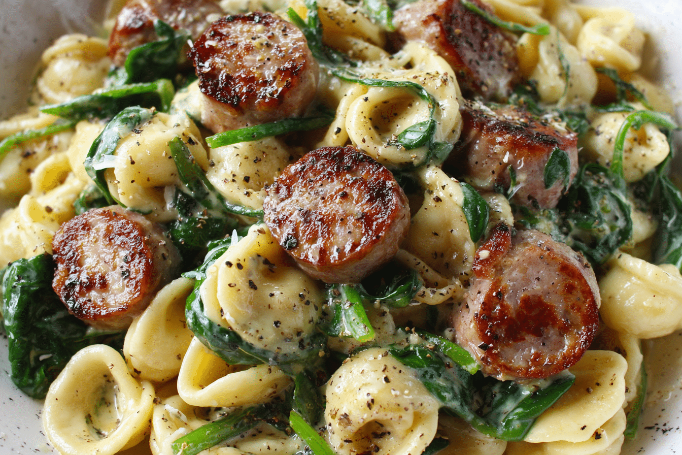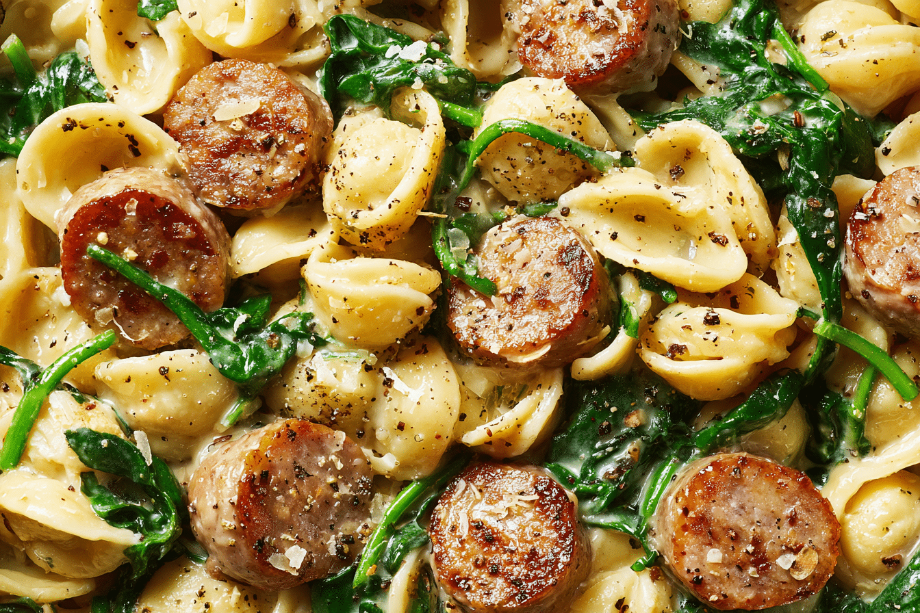 • Sauté spinach until wilted. Add pasta, protein, and sauce to skillet. Stir to coat and simmer 2–3 mins.