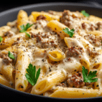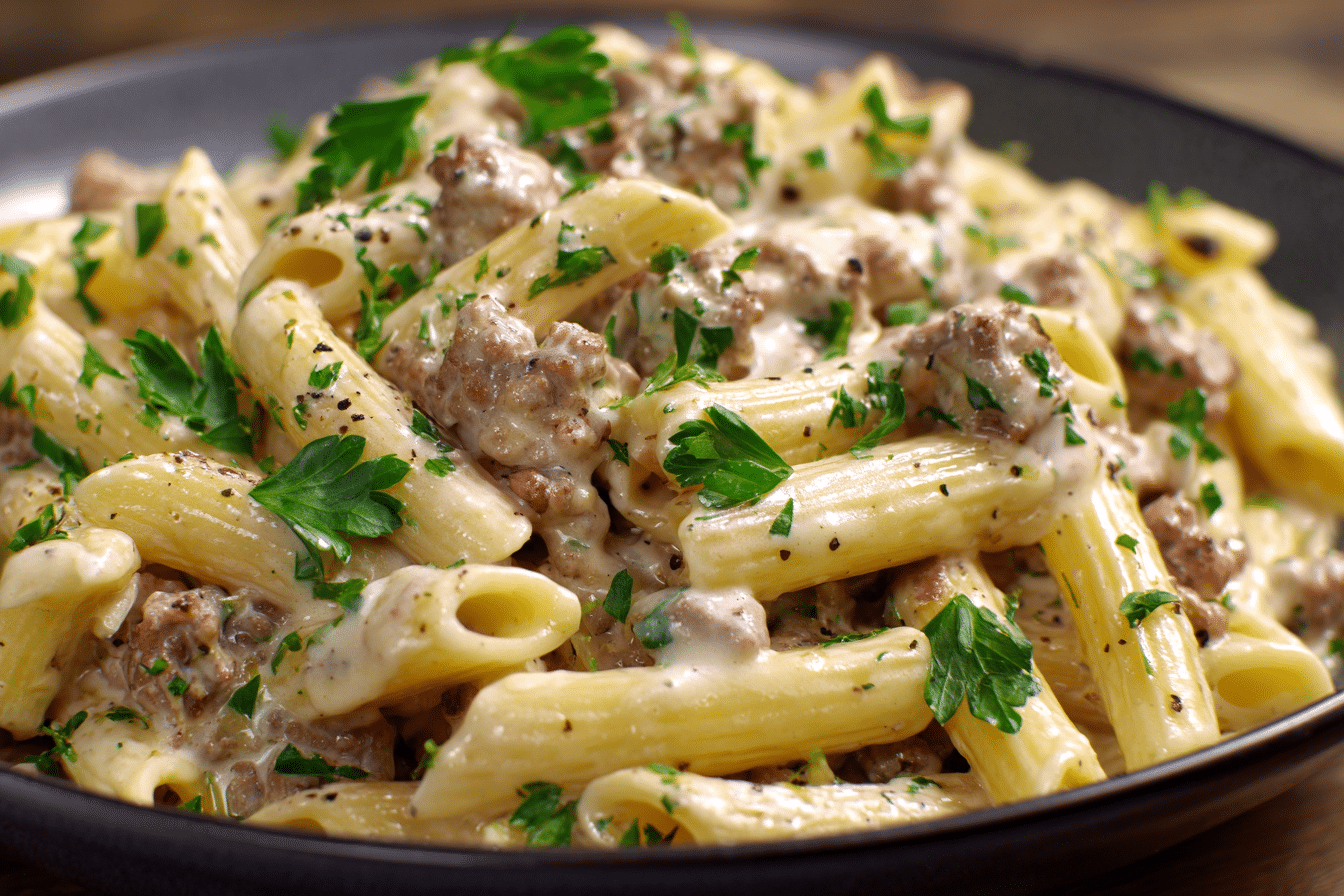 A protein-packed creamy beef pasta made in one pan with lean ground beef, high-protein pasta, and a Greek yogurt–based sauce. Hearty, filling, and ready in 30 minutes.