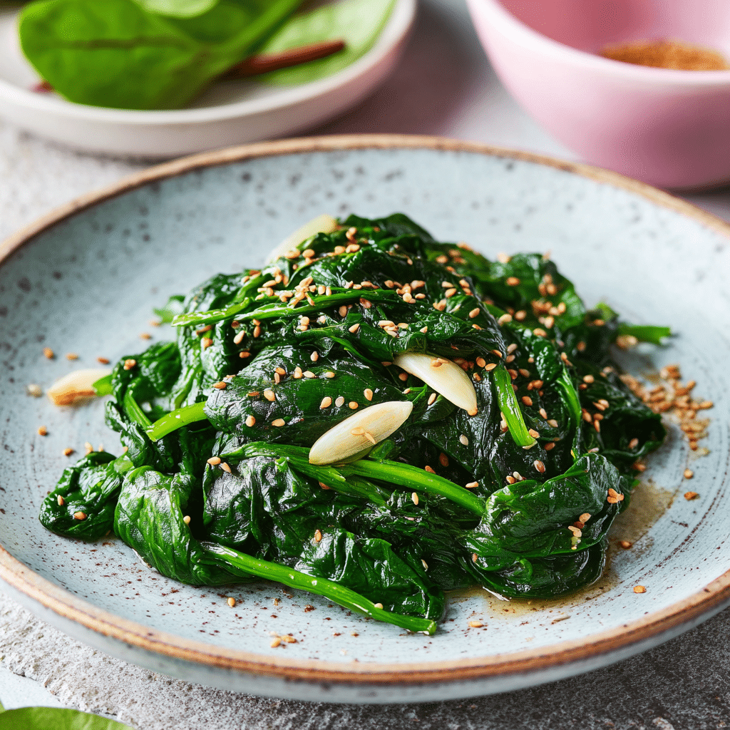Fresh spinach is the heart of the dish. Korean cuisine often uses the soft, flat-leaf kind, but baby spinach or regular mature spinach work well too. The spinach is blanched briefly to retain its bright green color and soft texture without becoming mushy. This process also removes oxalic acid, which can give raw spinach a slightly bitter taste.