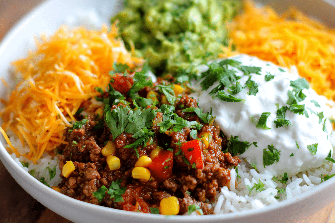 Seasoned protein forms the base of the bowl. Use lean ground beef (90/10) or ground chicken or turkey for a lighter version. Season with a homemade or sugar-free taco seasoning for the best flavor.