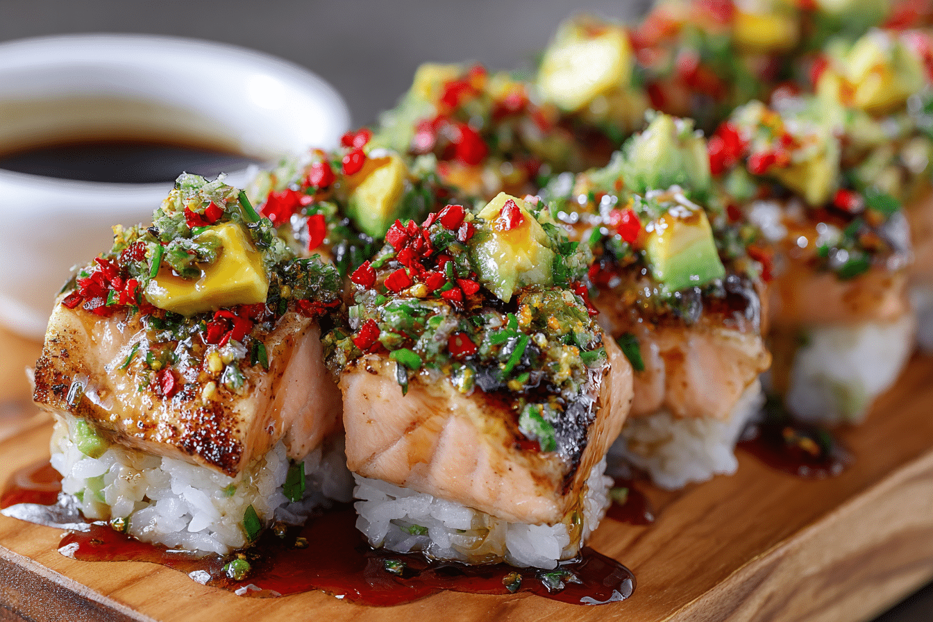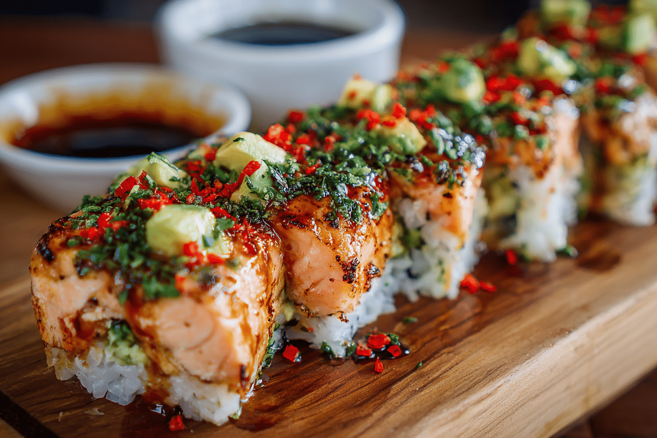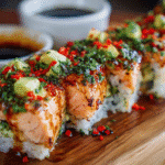 Inspired by Japanese-American fusion and the viral TikTok trend, this dish layers seasoned sushi rice, a creamy spicy salmon mixture, and savory toppings like furikake and sriracha mayo. The result? A rich, satisfying bite that captures all the sushi bar vibes—no rolling mat required.
