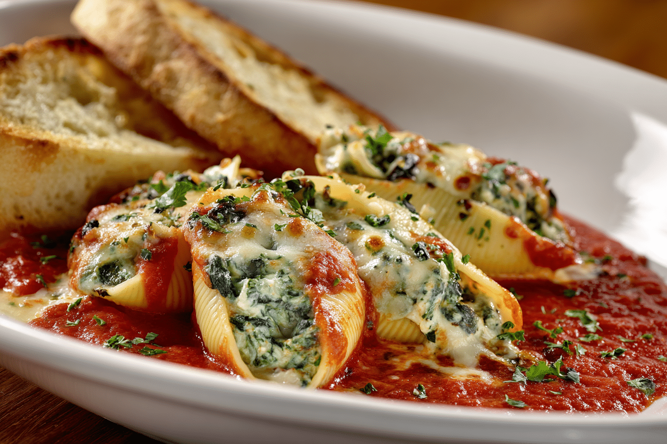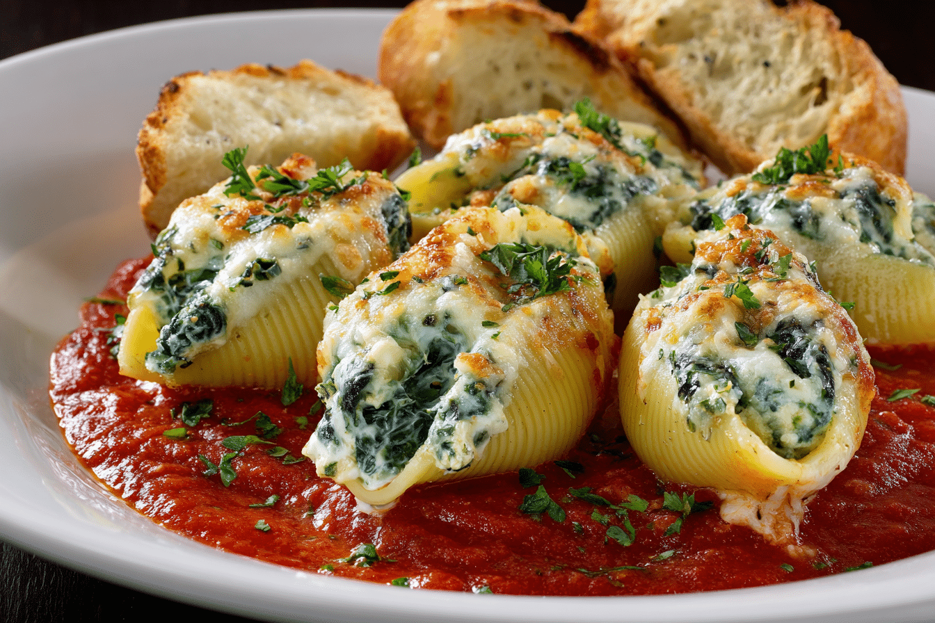 Jumbo pasta shells stuffed with a creamy spinach-ricotta filling, baked in marinara, and topped with melty cheese. A comforting, crowd-pleasing dinner.