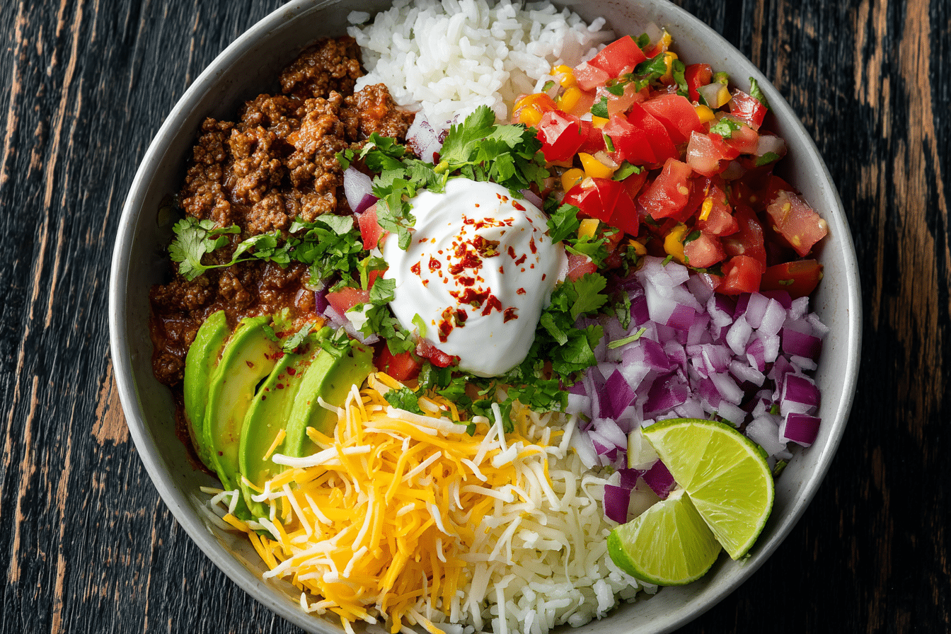 A quick and customizable taco rice bowl loaded with seasoned ground beef, fluffy rice, and all your favorite toppings. Perfect for weeknights or meal prep.