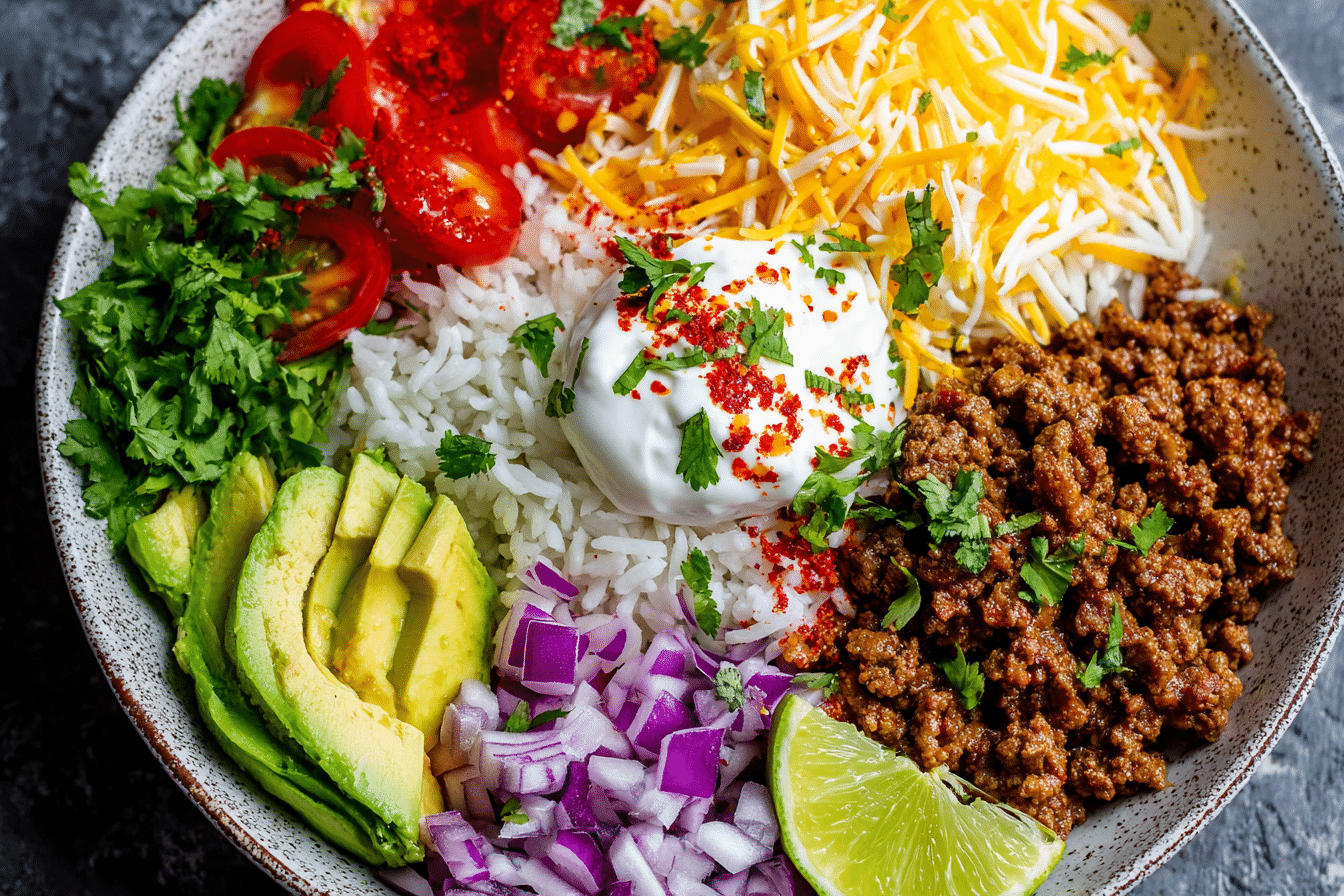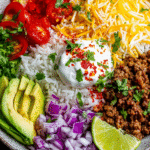 A quick and customizable taco rice bowl loaded with seasoned ground beef, fluffy rice, and all your favorite toppings. Perfect for weeknights or meal prep.