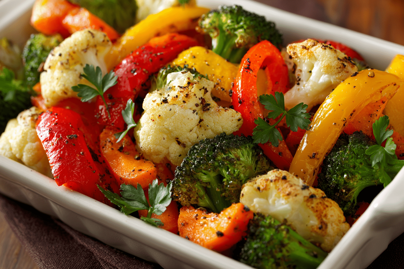 Garlic roasted vegetables are a powerhouse of fiber, vitamins, and antioxidants — and low in calories.