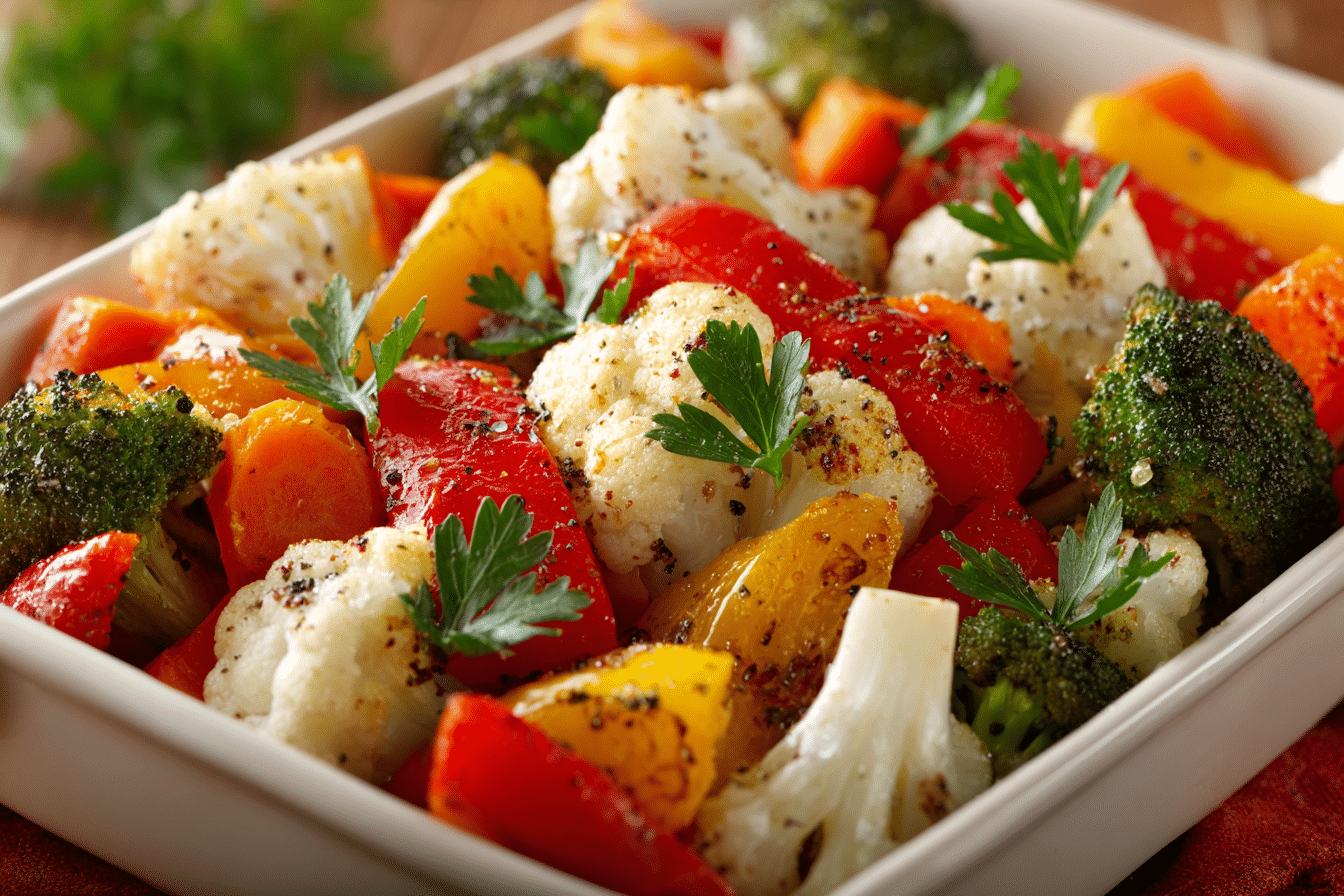 Colorful seasonal vegetables roasted with garlic and olive oil until caramelized and golden. A simple, flavorful, and healthy side dish perfect for any meal.