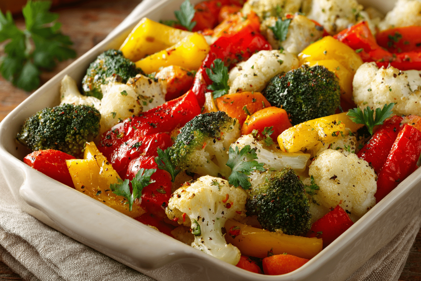 Colorful seasonal vegetables roasted with garlic and olive oil until caramelized and golden. A simple, flavorful, and healthy side dish perfect for any meal.