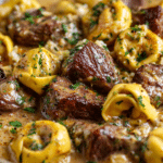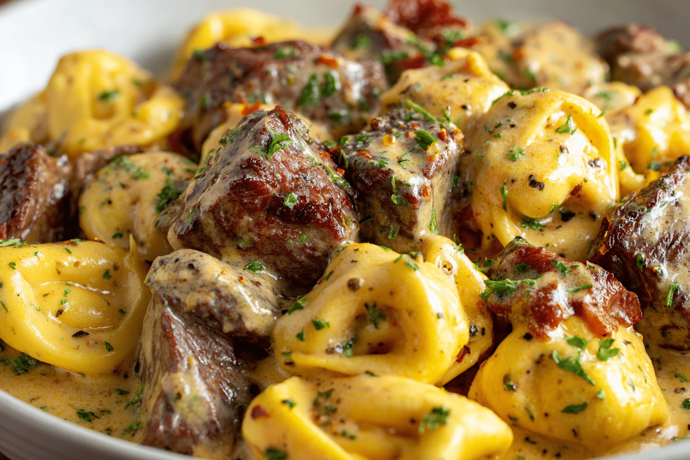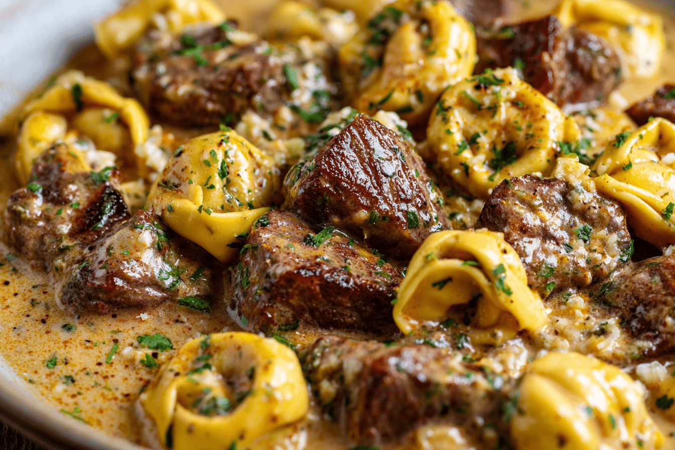 A creamy, garlicky skillet dish made with juicy seared steak and cheese tortellini tossed in a rich Parmesan cream sauce. Quick, satisfying, and perfect for weeknight dinners.