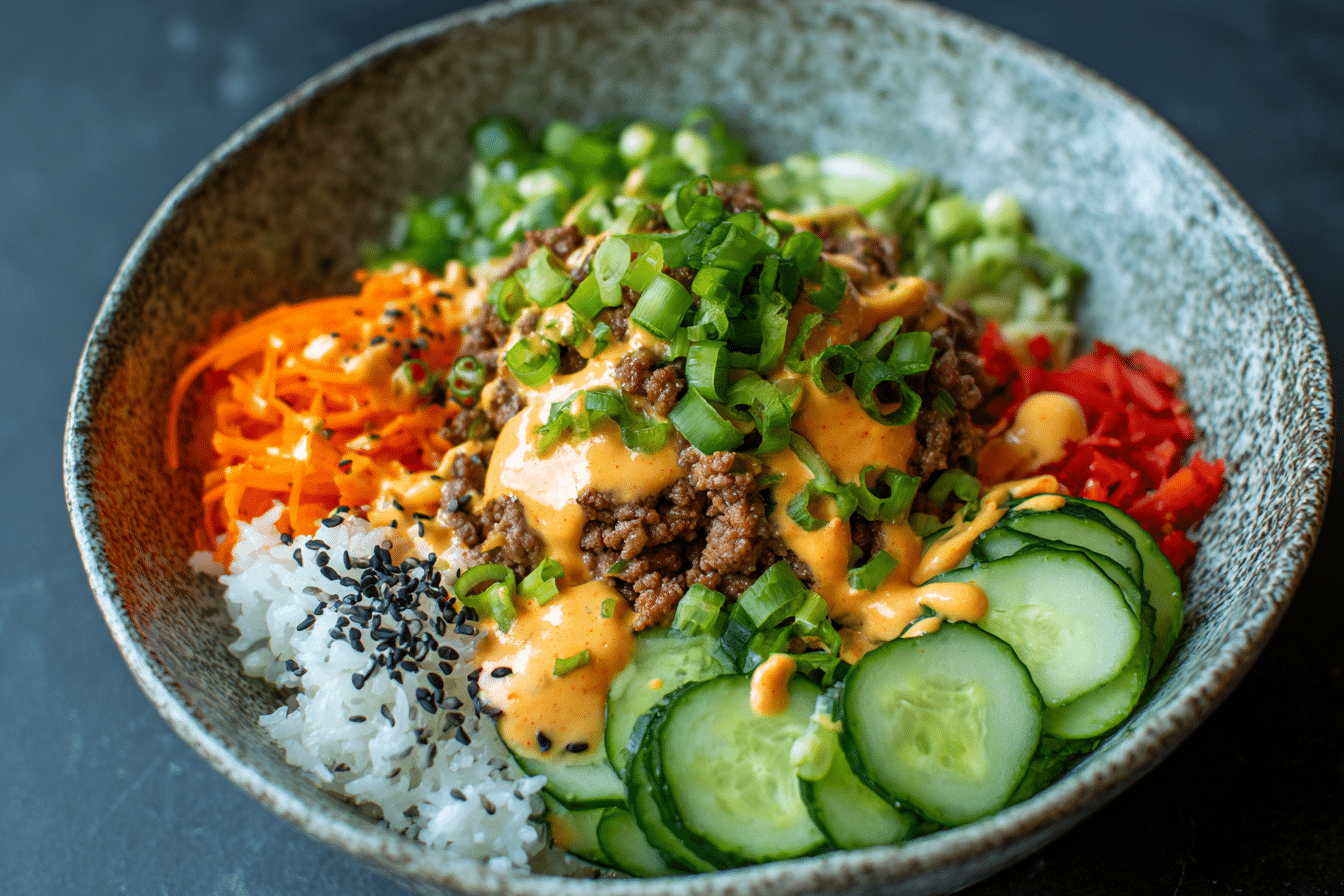 Savory ground turkey served over rice with fresh vegetables and topped with a creamy, spicy Bang Bang sauce — a fast, flavorful meal ideal for weeknights or meal prep.