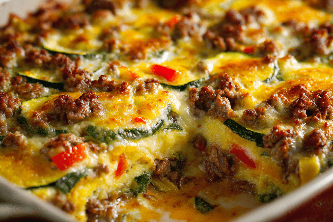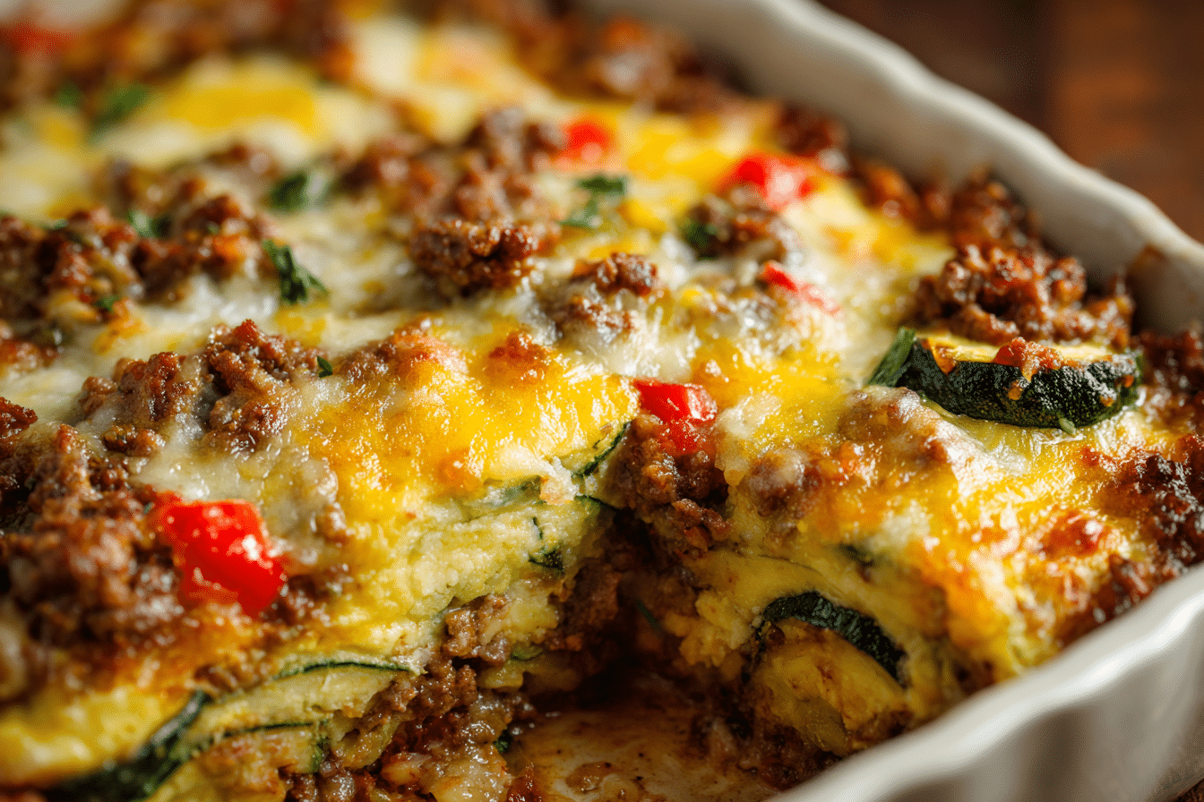 A savory, protein-packed casserole made with lean ground turkey, zucchini, herbs, cheese, and a creamy binder — baked until golden and bubbly.