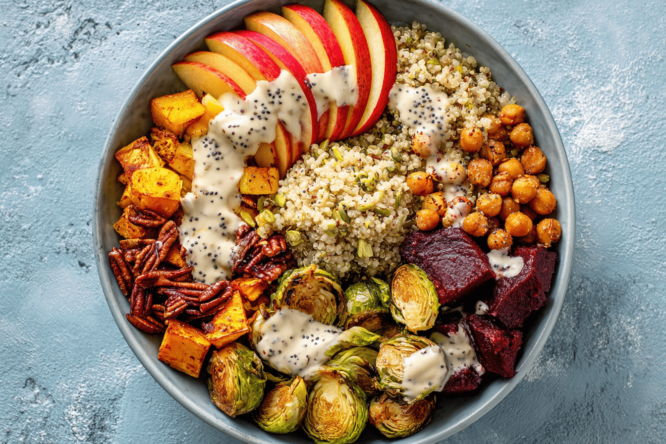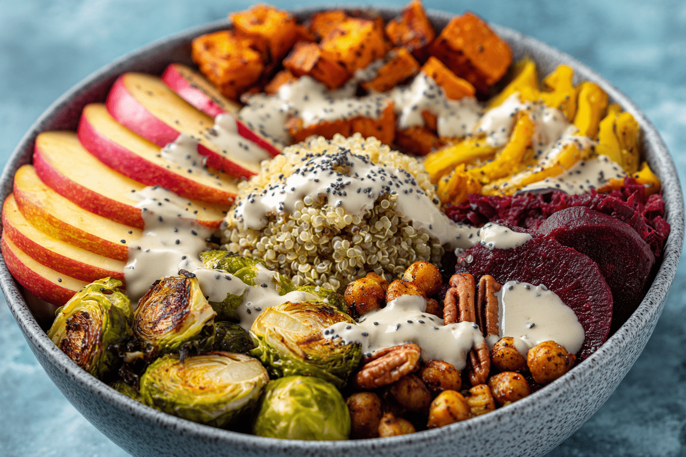 A hearty quinoa bowl packed with roasted vegetables, apples, kale, and a maple-Dijon vinaigrette—perfect for fall and winter meals.