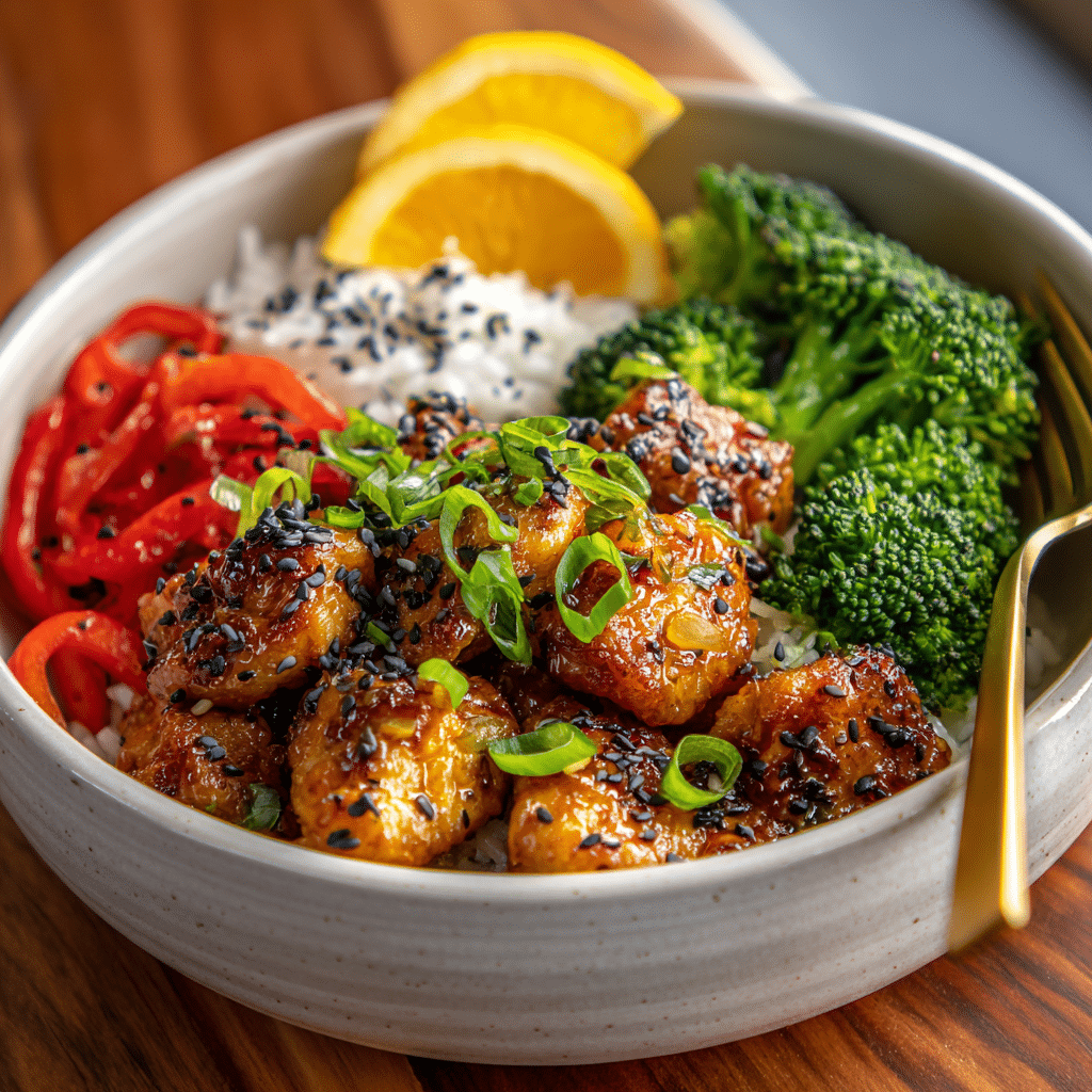 Poke bowls traditionally feature raw fish, but the beauty of the modern bowl lies in its flexibility. This version skips the raw fish in favor of lean orange chicken made with real orange juice, honey, ginger, and tamari (or low-sodium soy sauce). It offers the crave-worthy sweet-savory notes of Chinese takeout without the deep frying or heavy sugar.