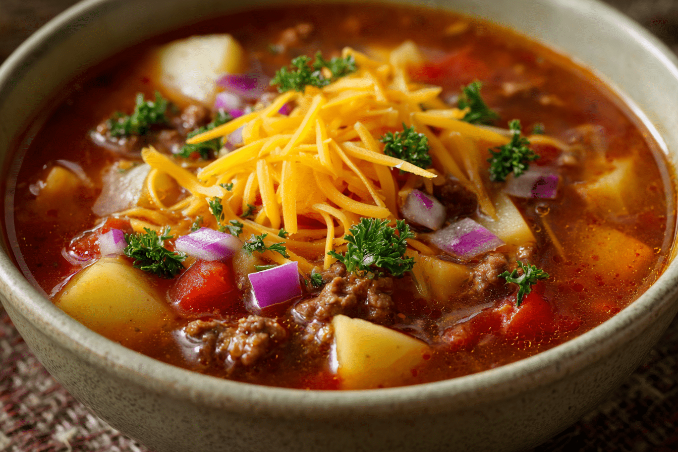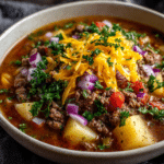 A creamy, comforting soup filled with ground beef, potatoes, veggies, and melted cheddar cheese — perfect for cozy nights.