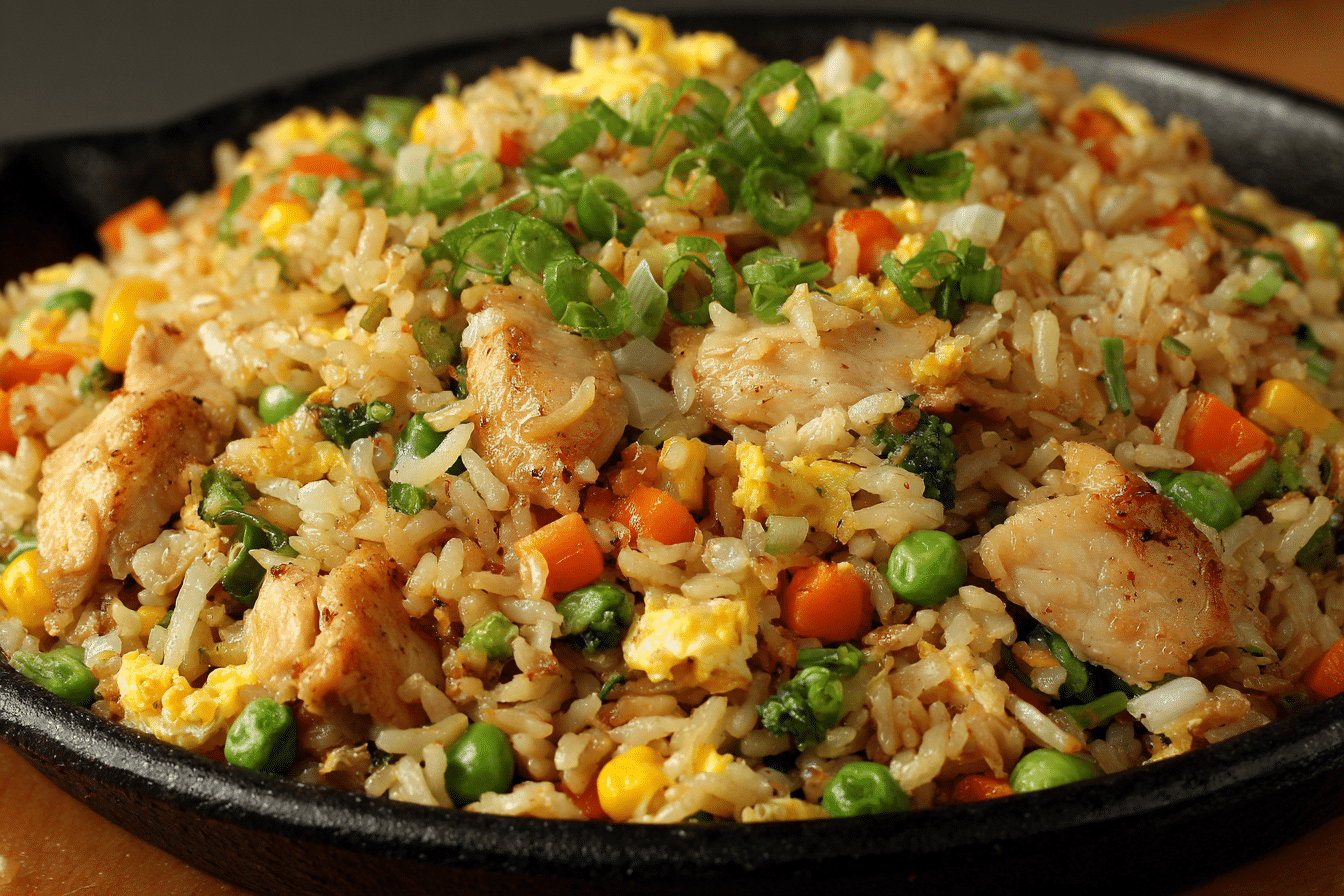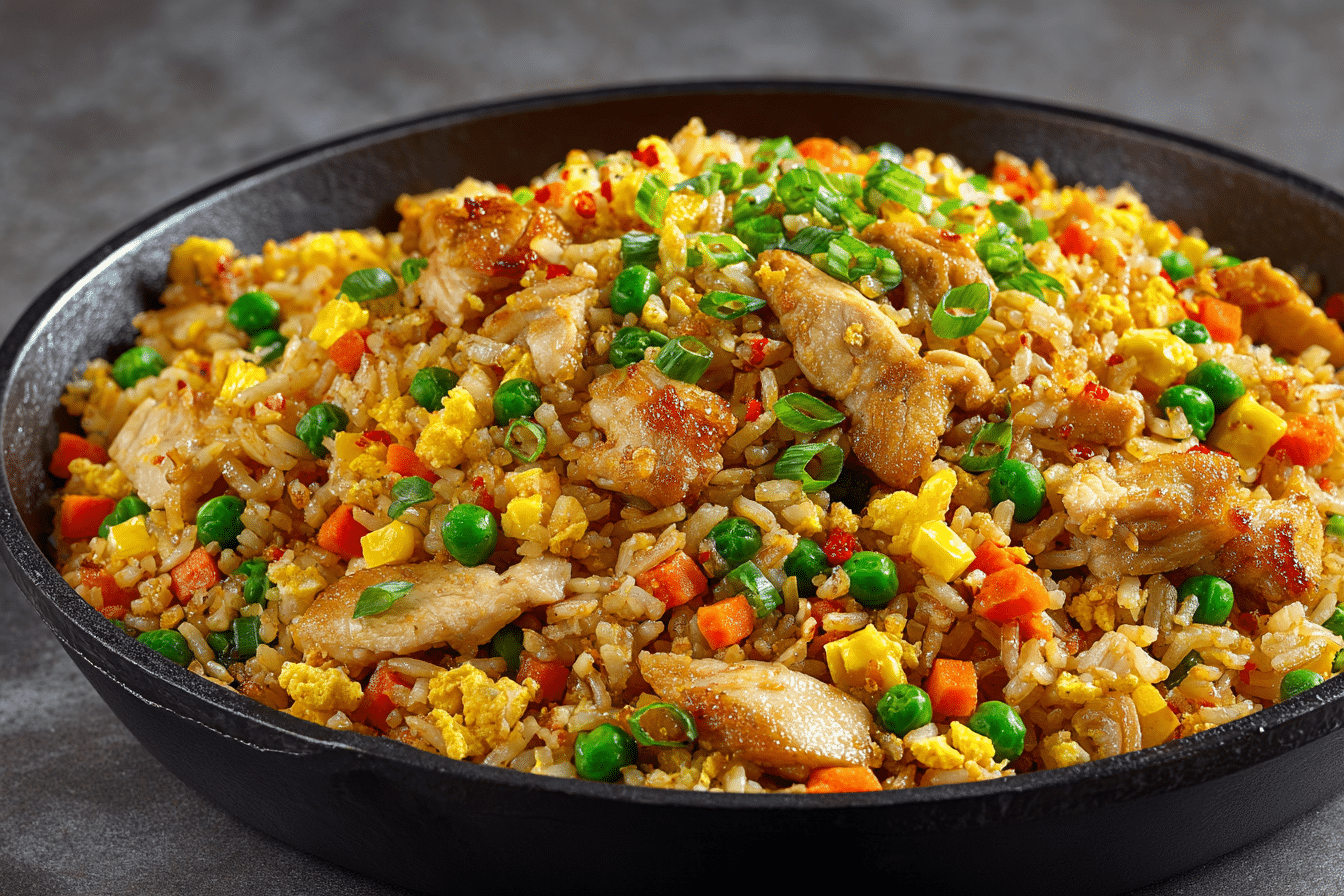 A protein-packed twist on classic chicken fried rice, loaded with lean chicken breast, fluffy eggs, vegetables, and brown rice—all cooked in a savory garlic-ginger soy sauce blend.