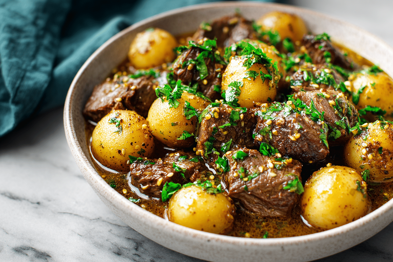 Tender slow-cooked beef bites simmered in a rich garlic butter sauce. High in protein and full of savory flavor — perfect for meal prep or a cozy dinner.