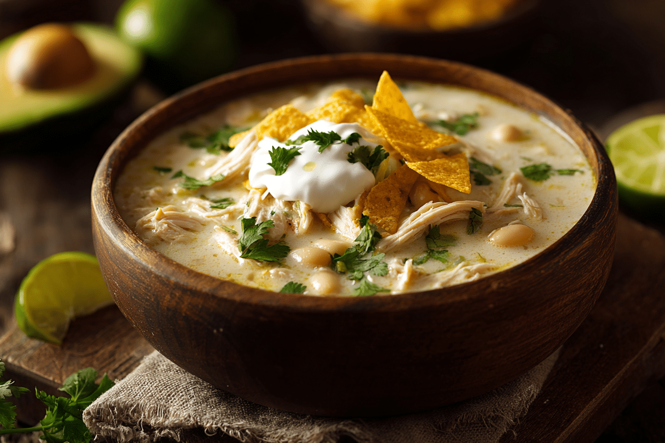 A creamy, protein-rich white chicken chili made with tender chicken, white beans, green chilies, and Greek yogurt for a lightened-up comfort food favorite.