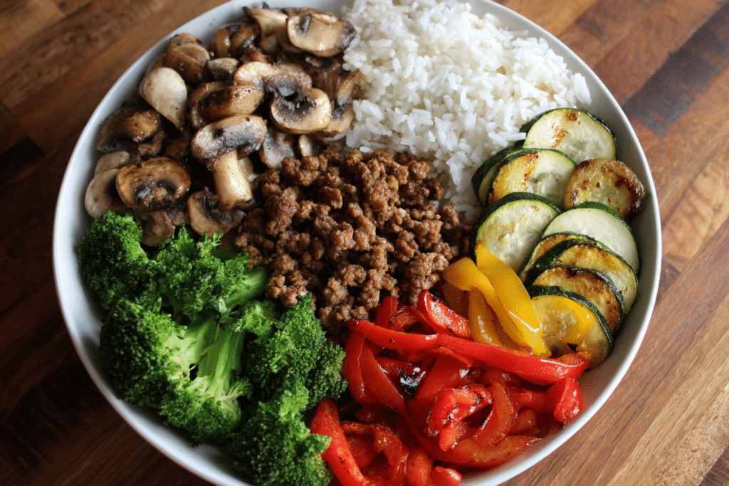 Spicy Ground Beef Stir-Fry Bowl with Garlic Veggies & Steamy Rice