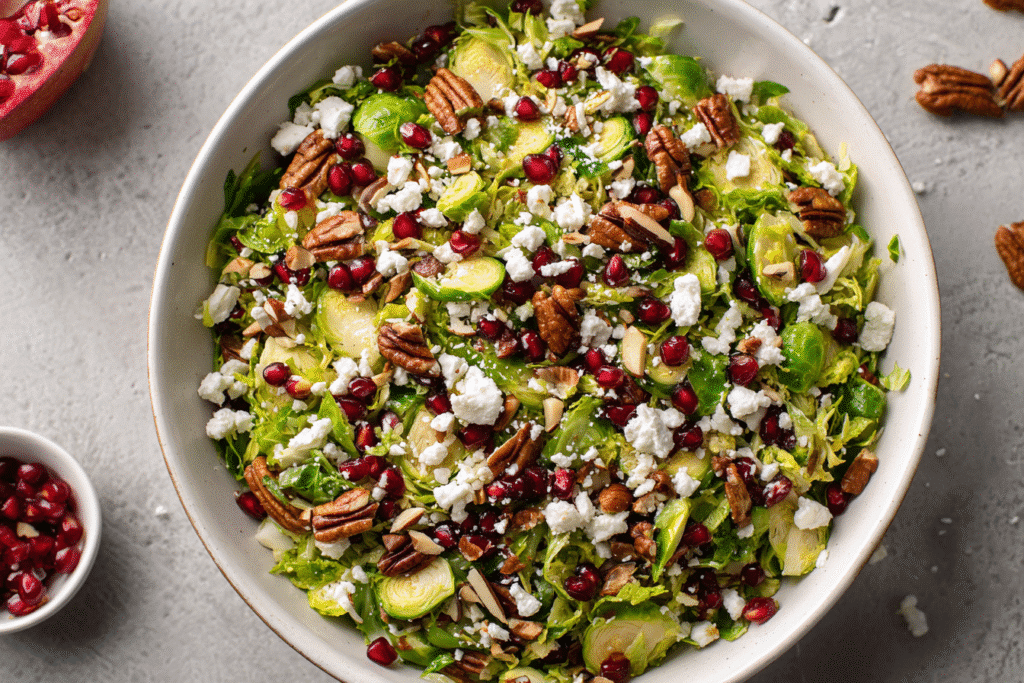 Shaved Brussels sprout salad with pomegranate and candied pecans is a crisp, festive dish that turns humble ingredients into something vibrant and irresistible. Unlike traditional cooked Brussels sprouts, this version …