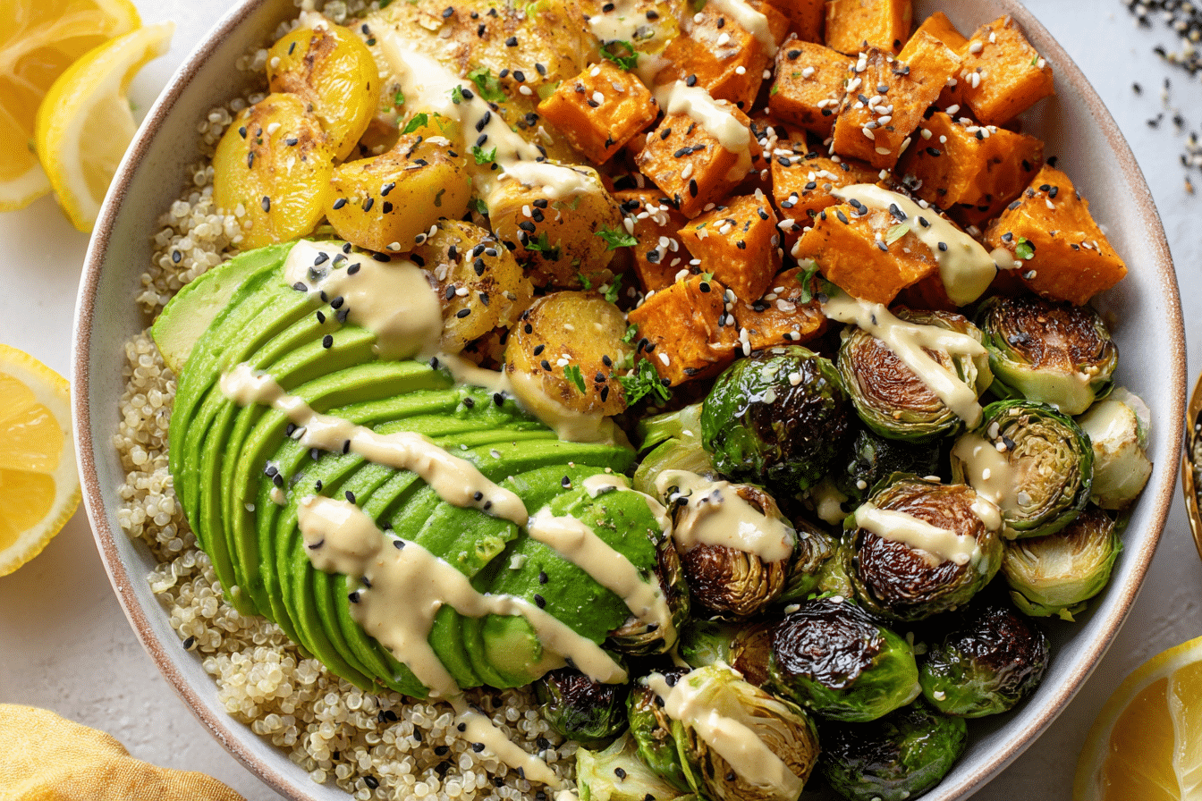 In this version, we focus on roasted seasonal vegetables, hearty grains, and a punchy tahini or lemony yogurt dressing. It’s a satisfying, customizable dish perfect for meal prep, weeknight dinners, or post-workout refueling.