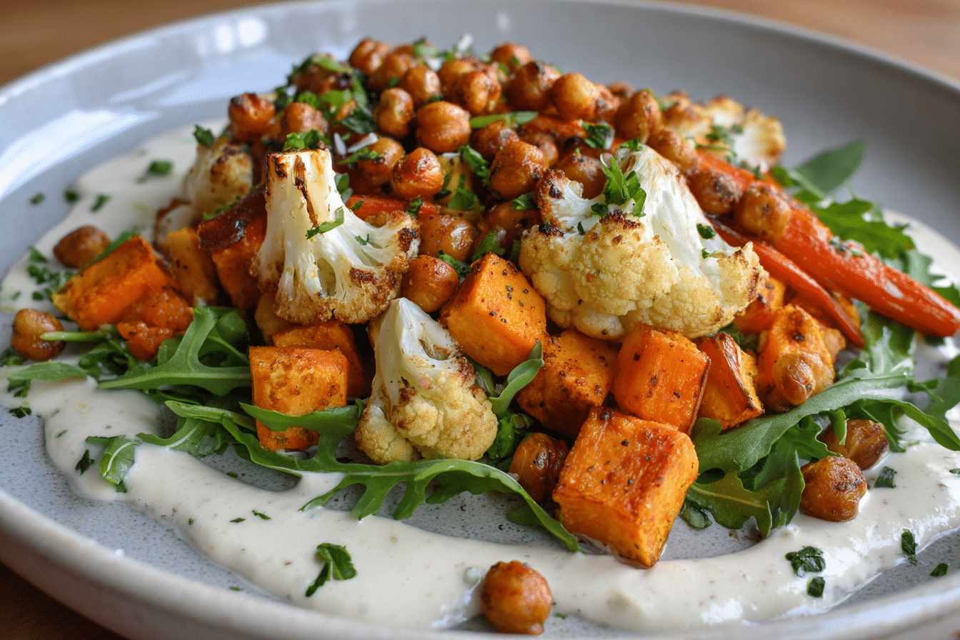 A colorful medley of roasted vegetables served with a creamy, tangy tahini yogurt sauce. Perfect for meal prep, sides, or a vegetarian main course.