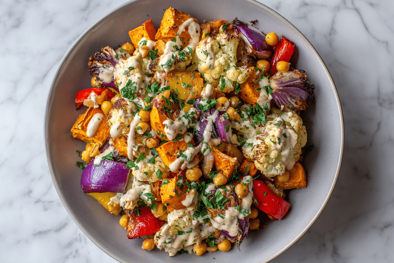 A colorful mix of roasted vegetables served over creamy tahini yogurt sauce, finished with herbs and optional garnishes. Healthy, bold, and full of flavor.