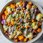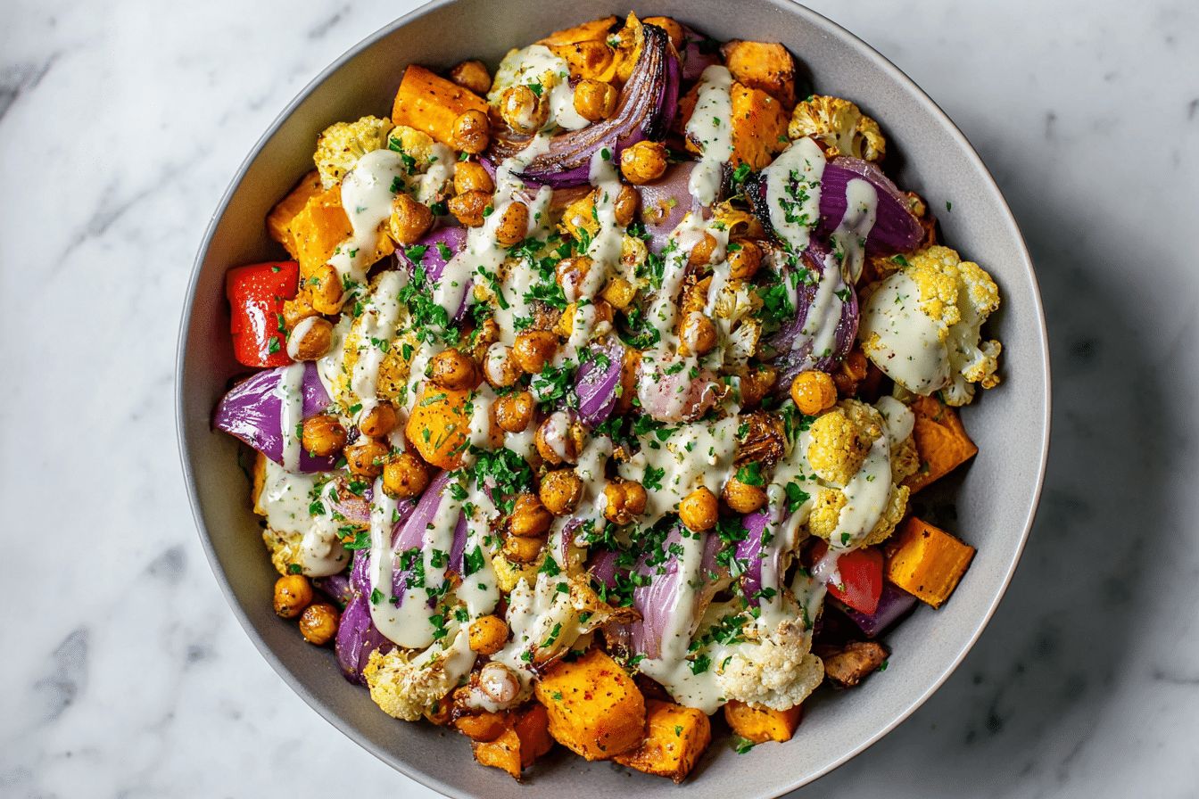 A colorful mix of roasted vegetables served over creamy tahini yogurt sauce, finished with herbs and optional garnishes. Healthy, bold, and full of flavor.