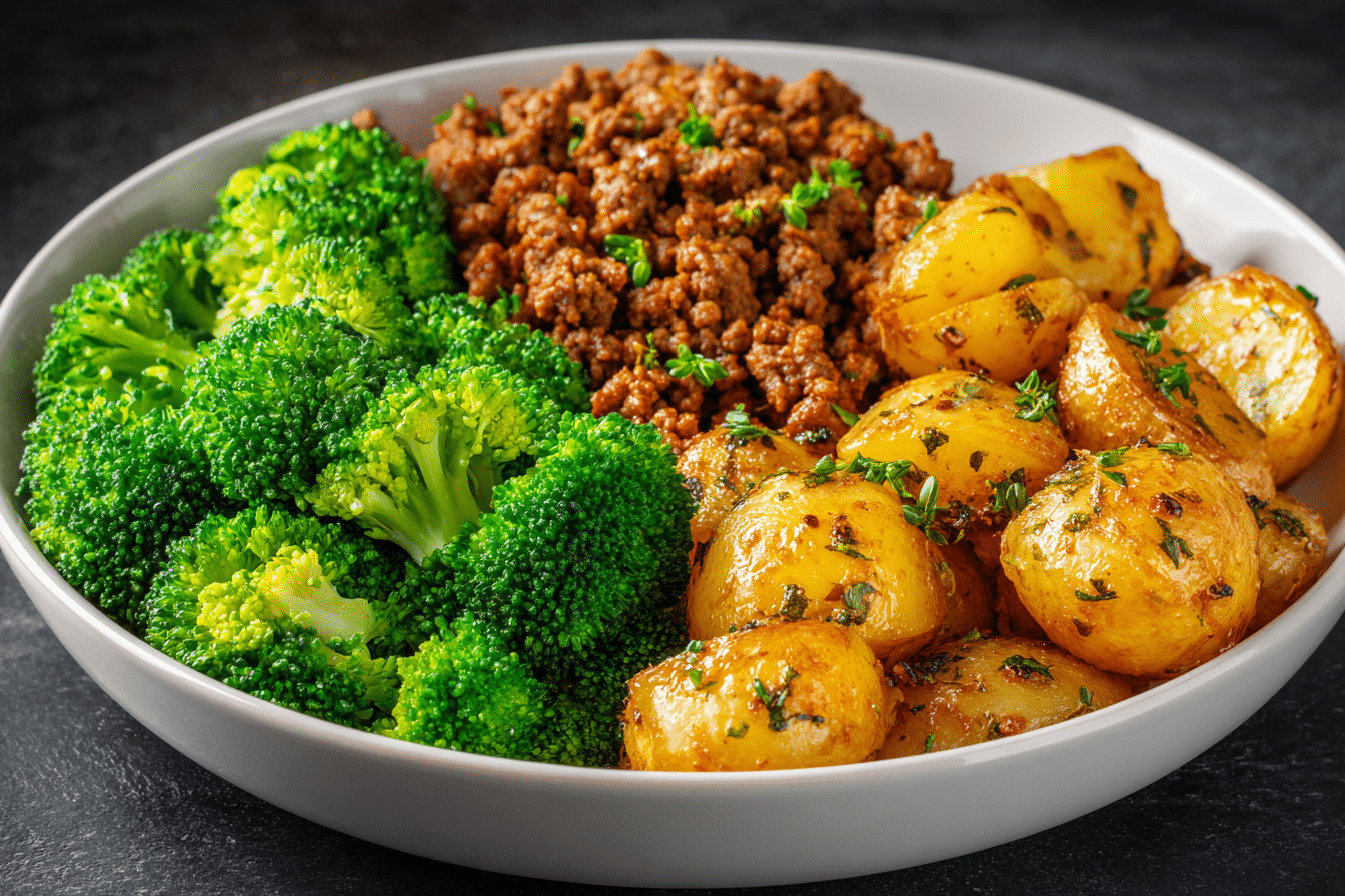 A savory, balanced dinner featuring seasoned ground beef, crispy herb-roasted potatoes, and tender steamed broccoli. A comforting one-plate meal with clean, satisfying flavor.