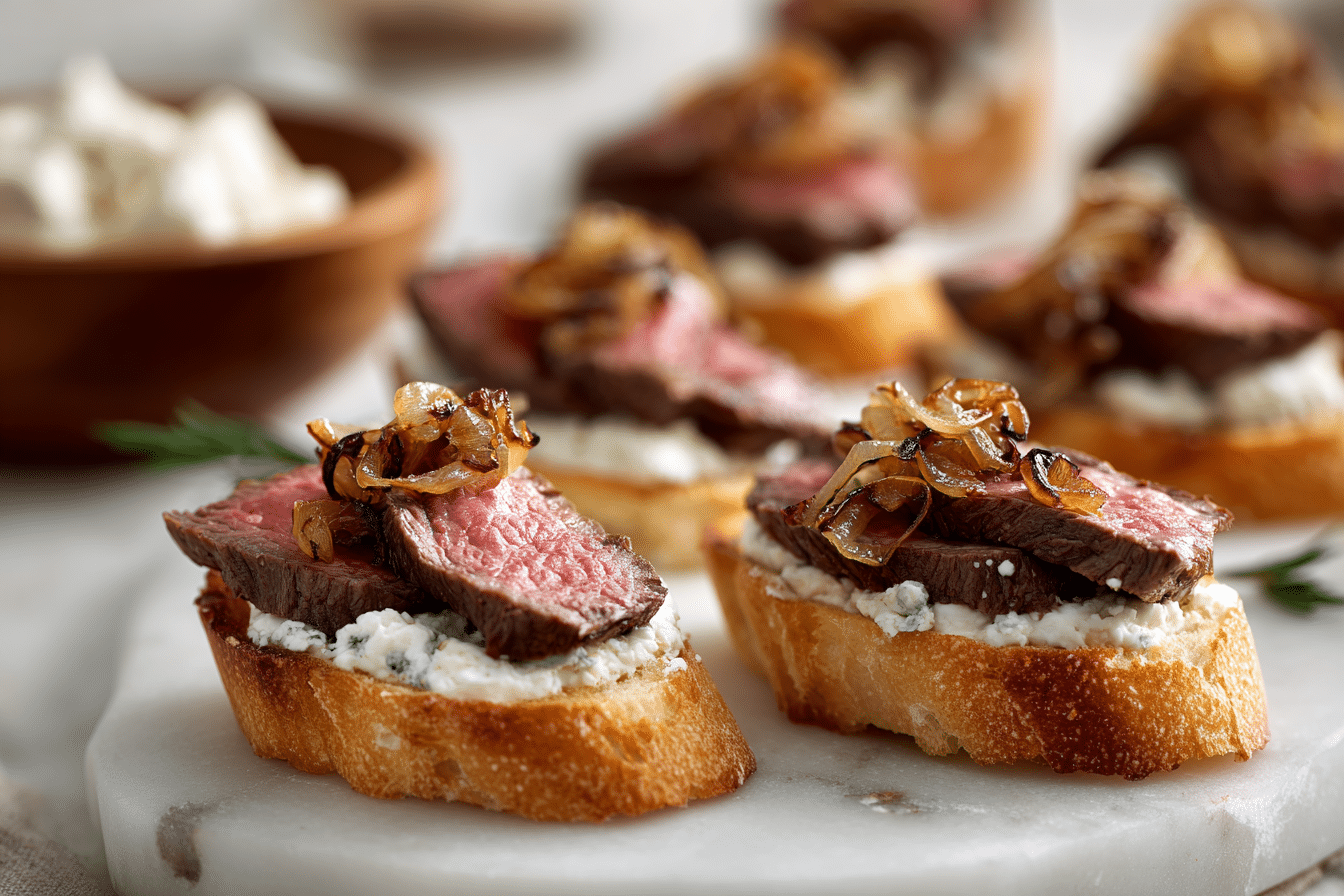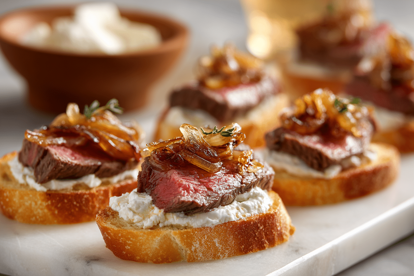 Savory steak crostini topped with creamy horseradish sauce and caramelized onions — perfect for elegant appetizers, cocktail parties, or special occasions.