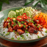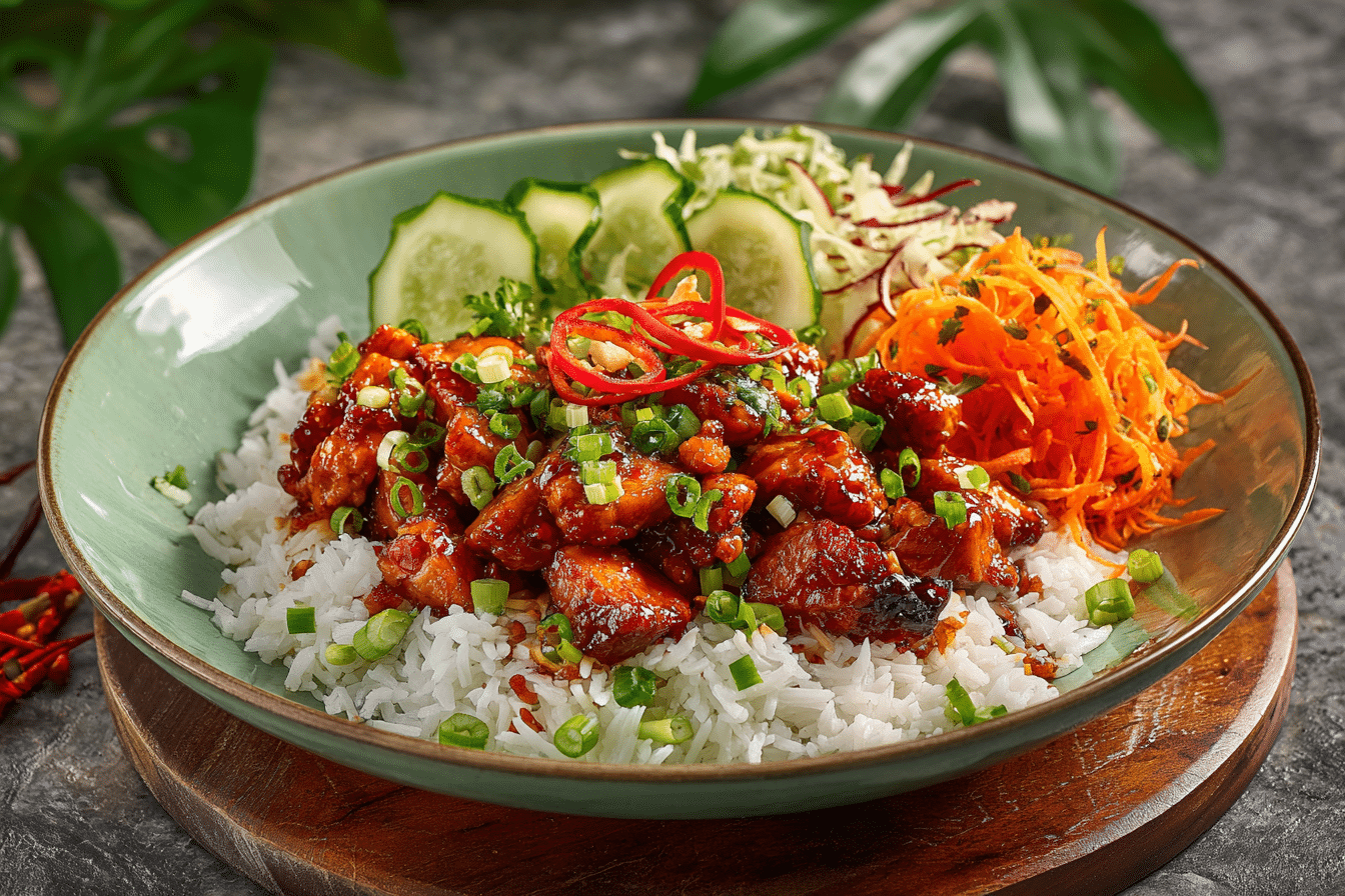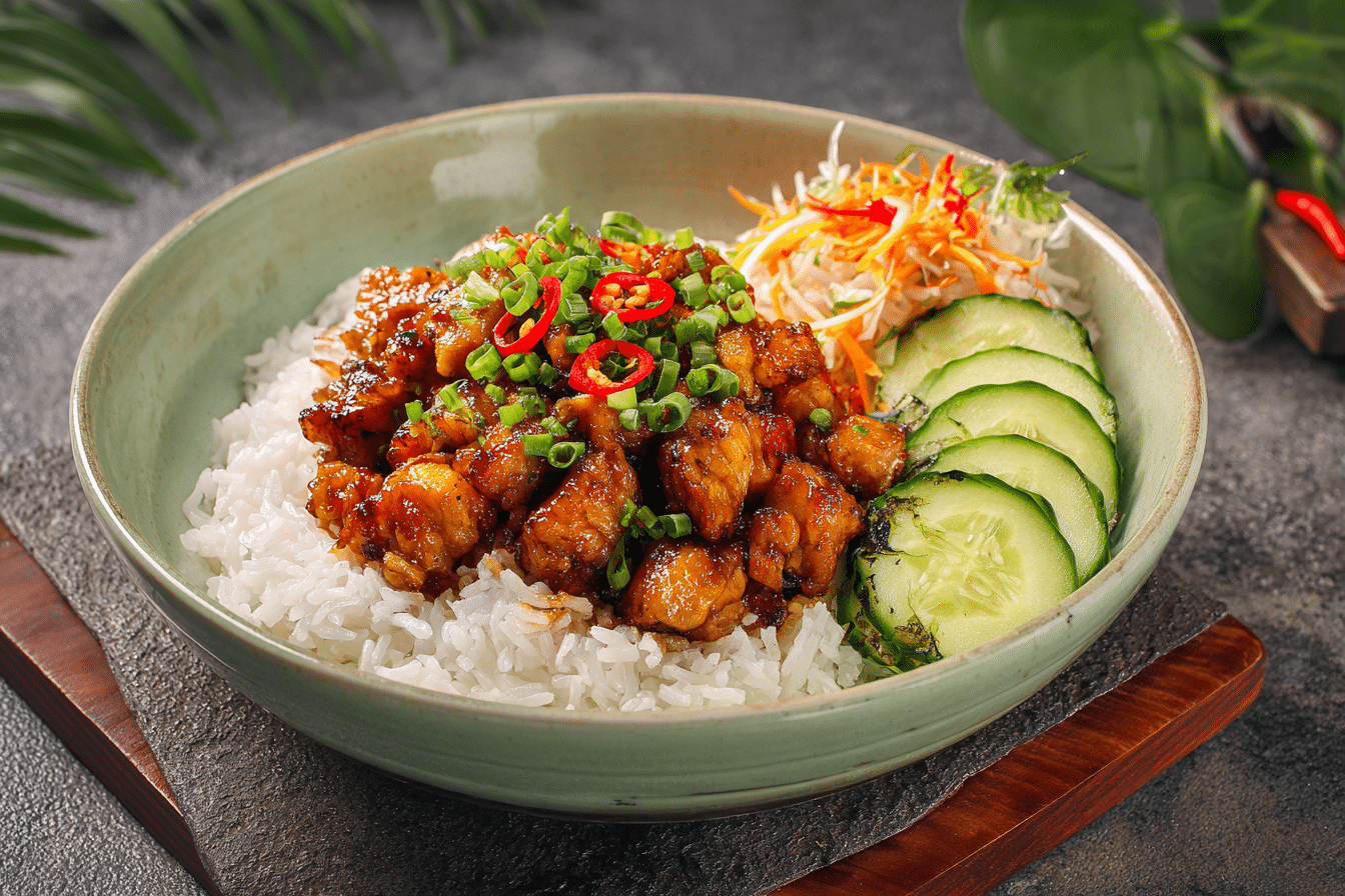 When it comes to quick, flavorful, and satisfying meals, Sweet Chili Chicken Rice Bowls with Chicken Thighs are hard to beat. This dish blends sweet, tangy, and slightly spicy notes with the rich, juicy texture of pan-seared chicken thighs, all served over fluffy rice and topped with fresh vegetables and herbs.