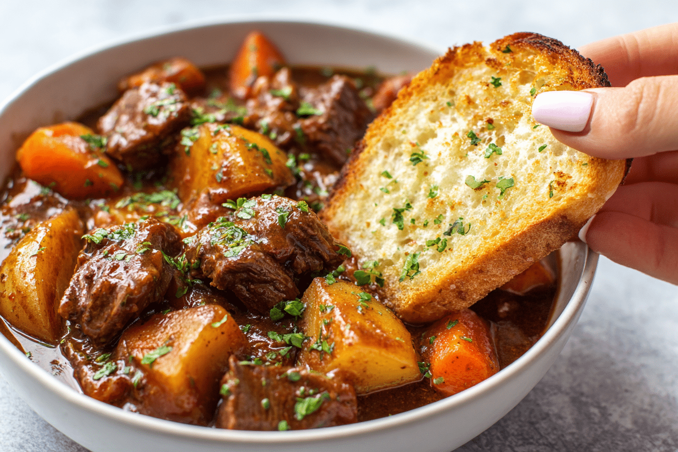 A hearty, slow-simmered beef stew packed with tender chuck roast, carrots, potatoes, and herbs in a savory red wine gravy — pure comfort in every bite.